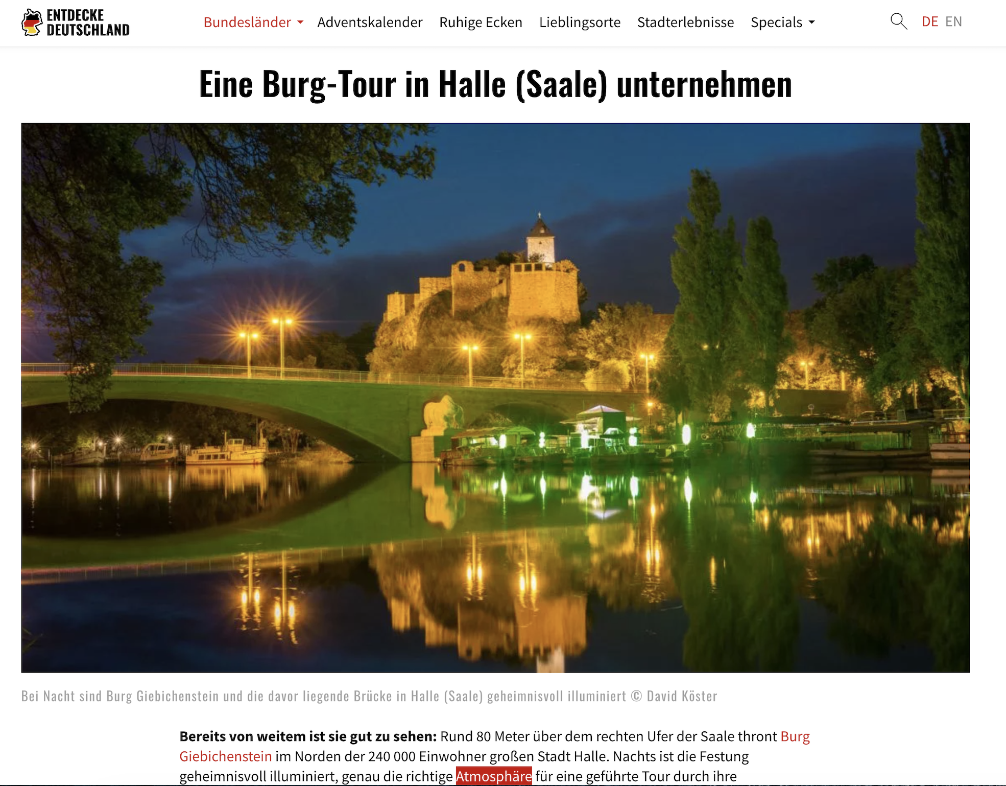 Das Tourismusportal nutzt mehrere meiner Bilder aus der Serie mit Deutschland Landschaftsbildern, speziell Destinationen aus Sachsen-Anhalt. Entdecke-Deutschland.de ist ein gemeinsames Projekt aller 16 Bundesländesmarketingorganisationen und der CMR Cross Media Redaktion GmbH.